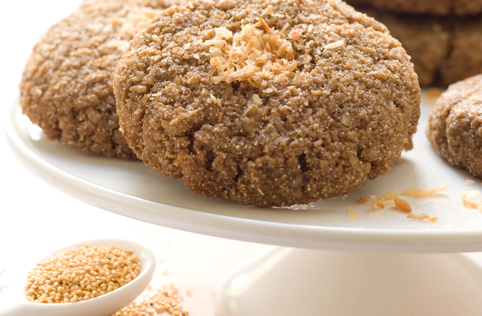 Batir la manteca con el azúcar, hasta obtener una crema agregar el huevo y batir hasta integrar. Agregar el coco rallado, la harina de amaranto, la esencia y mezclar bien.